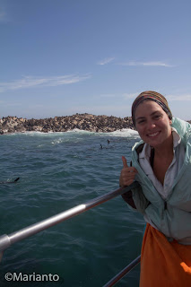 Después de salir del agua nos dirigimos hacia una isla donde hay miles de miles de focas. Si han visto shark week o cualquier programa de esos de Discovery/Nat Geo que muestra los tiburones blancos saliendo del agua brincando metros cazando focas – bueno, es ahí donde hacen eso. Solo que eso sucede normalmente en el invierno cuando el agua esta mas caliente (si, en verano esta mas fría el agua…el viento hace que el agua caliente se vaya). Las focas APESTAN. O sea, literalmente las hueles a distancia y es como un olor pescadoso asqueroso. No le tienen miedo ni nada al barco asi que brincan y curiosean muchísimo, a un metro del barco hay cientos y en las rocas miles, buenísimo!