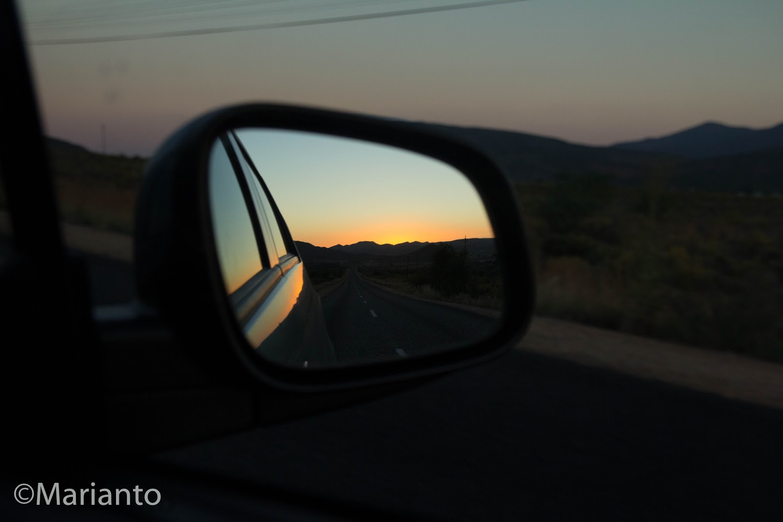 Mas adelante paramos en Barrydale, todo esto sigue siendo zona de viñedos y los paisajes son espectactulares – viñedos gigantes con las montañas detrás. Almorzamos/comimos algo y seguimos manejando. El atardecer que nos toco estuvo divino, las montañas se volvieron rosadas y el sol bajaba a nuestras espaldas. Yo iba manejando asi que no pude tomar muchas fotos pero algo se logró y lo que no, lo tengo en mi memoria.